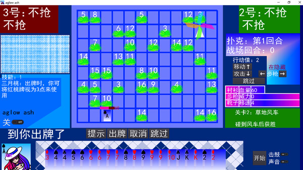 就是斗地主刷力量来走格子战斗的回合玩法, 单机游戏,回合制游戏,有点像rpg,卡牌游戏, 一开始可以选择技能关卡,武器和鞋子, 抢牌后,同时在扑克牌斗地主和战场格子进行玩耍, 只有扑克牌赢了,并且格子战场胜利了才算关卡通过, 而由于游戏简陋,关卡什么的就不设置卡关和存储了, 就直接随便选,休闲玩就行,打完每关后会有简陋的剧情和声音播放, 扑克牌斗地主规则有些不同,主角可以选技能, 战场格子也是,多点几次就会玩了